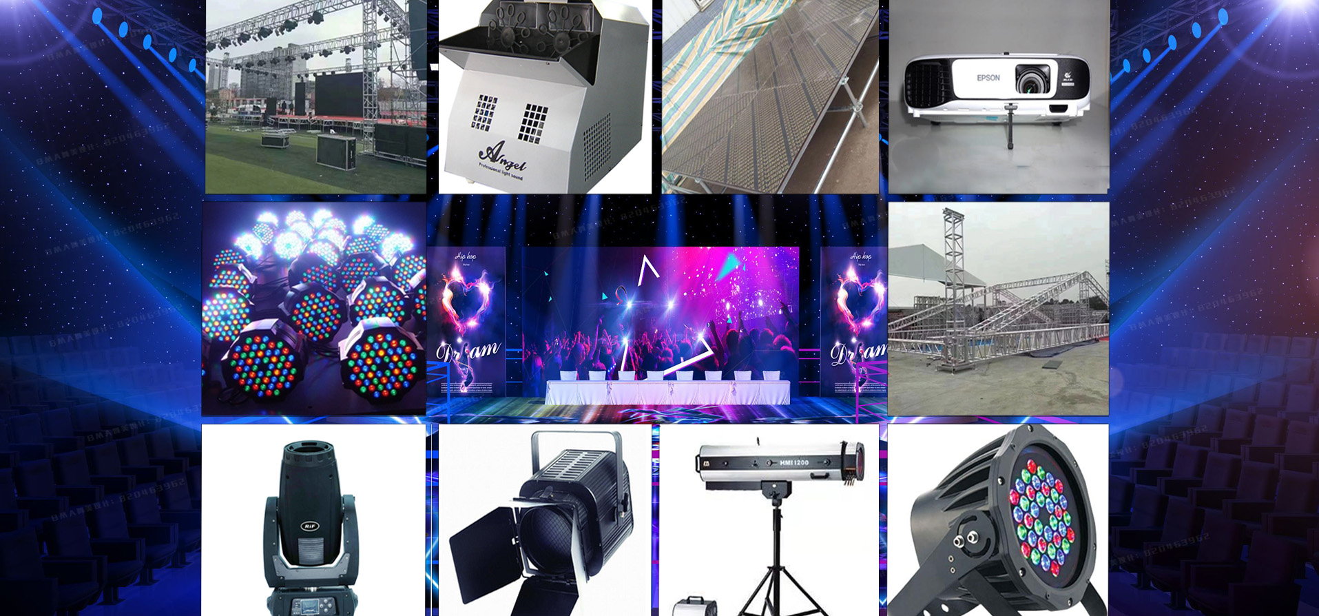 提供全程策劃執行及燈光、音響、舞臺、背景、座椅、攝影攝像器材、氣球、拱門等設備租賃